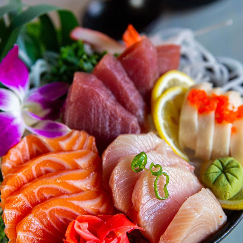 A vibrant sashimi platter garnished with lemon, shredded daikon, and…