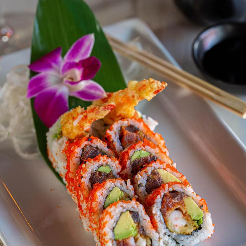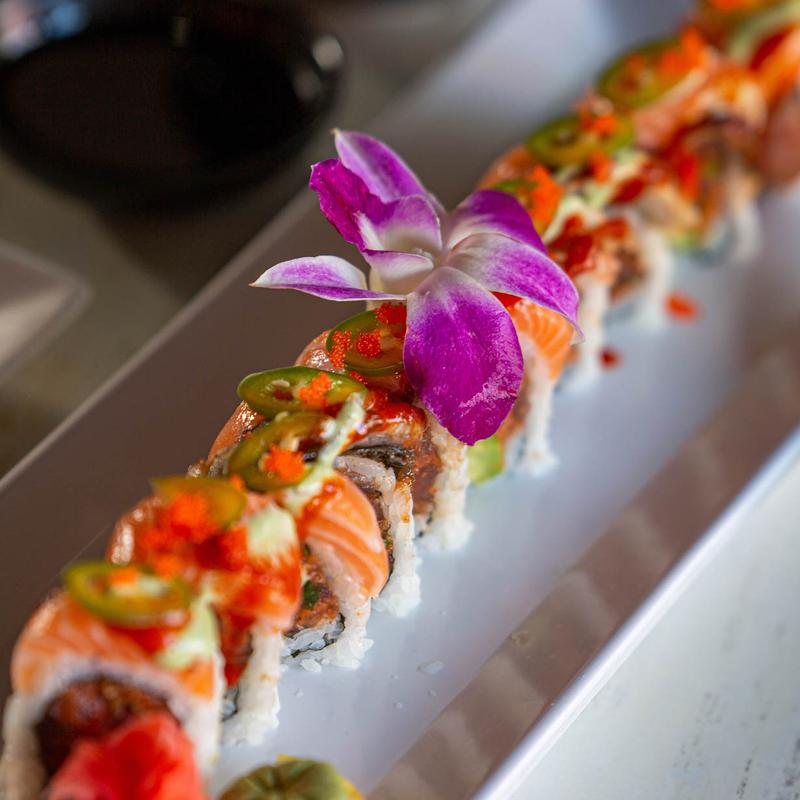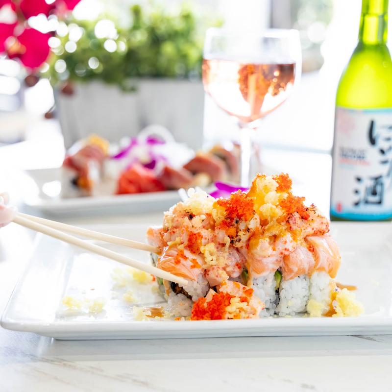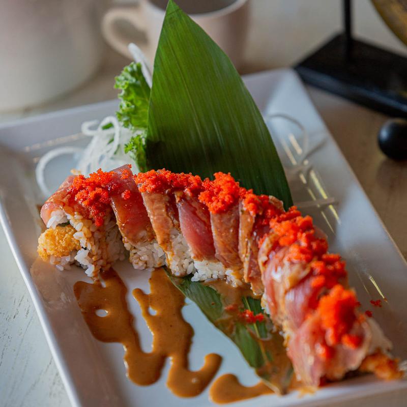 Jasmin Roll with spicy tuna, toped with salmon, roe, and jalapeno