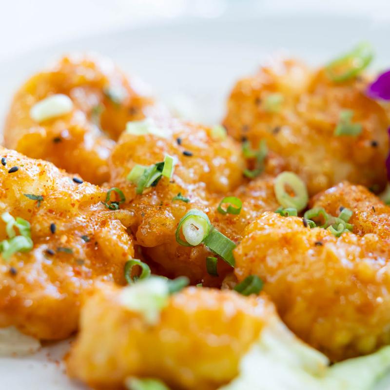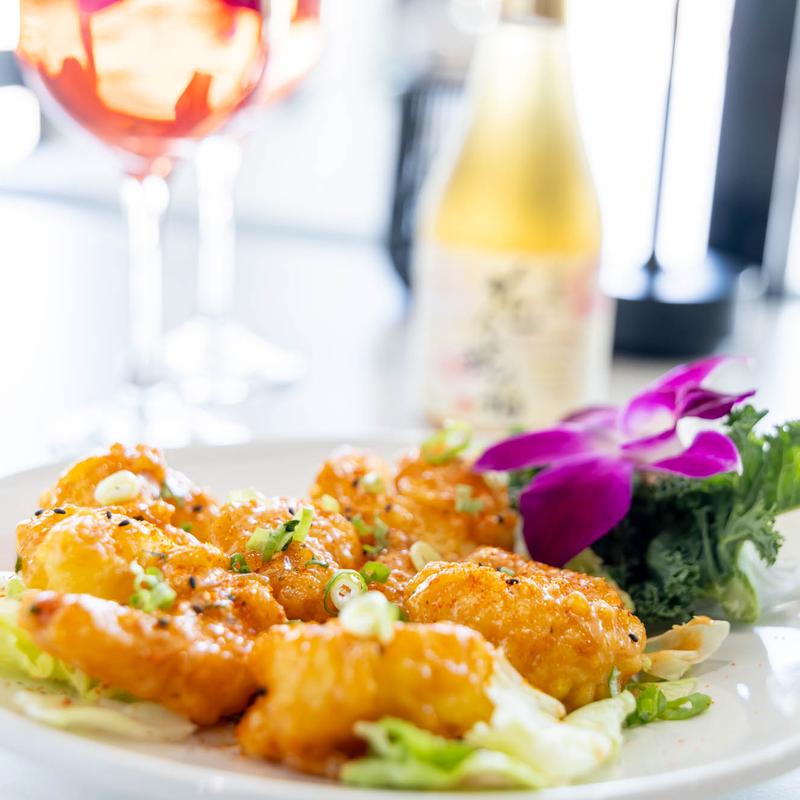 Spicy tuna crispy rice roll topped with tobiko, jalapeno, and…